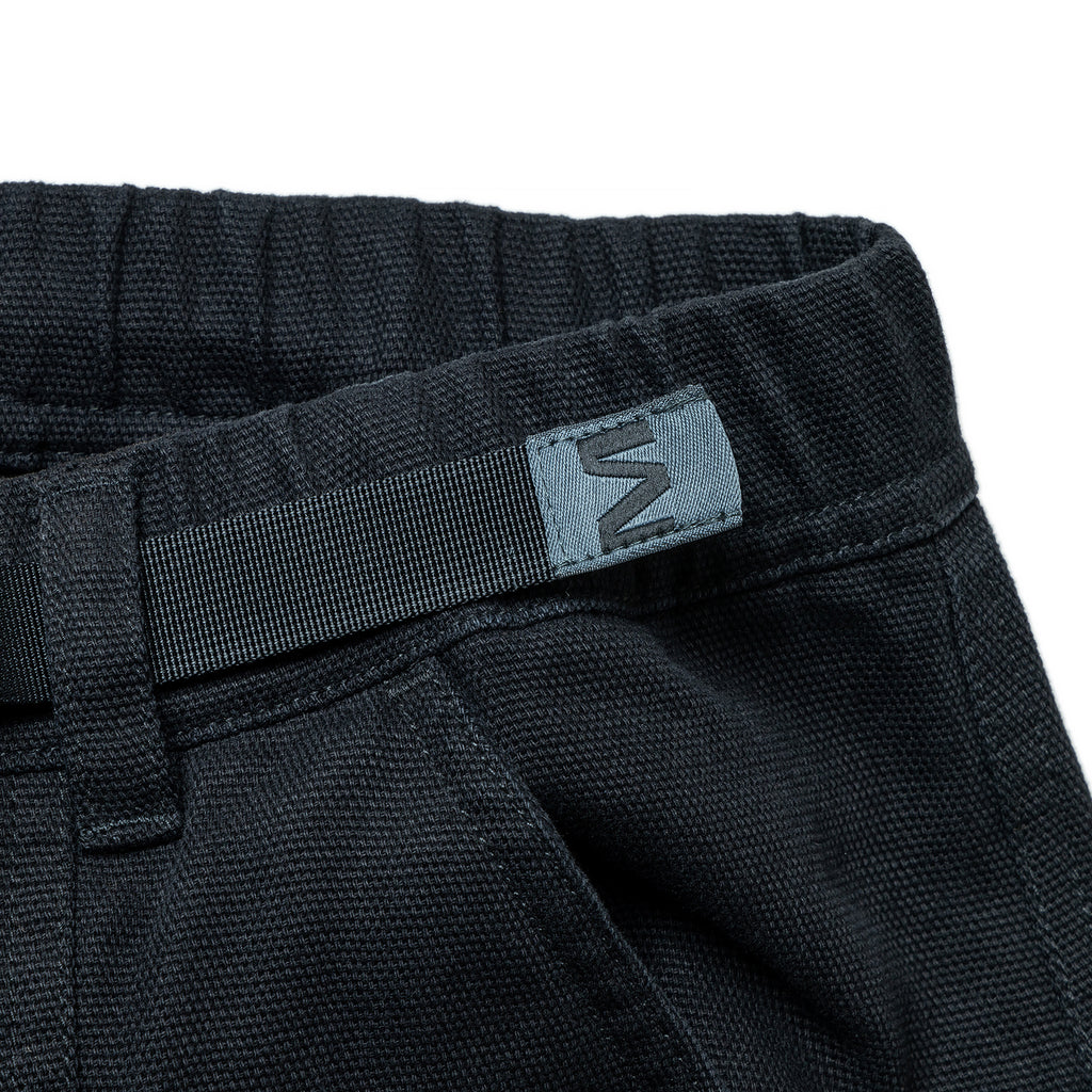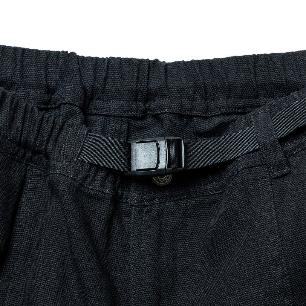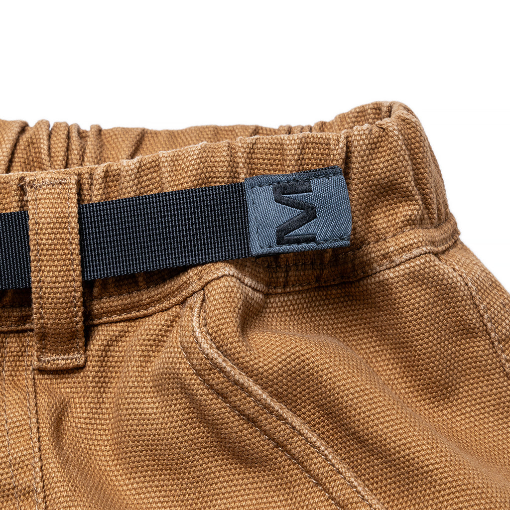 ウエストはウェビングベルトで調整可能で、ベルト先にはMロゴのオリジナル織りネームを作成して付けました。