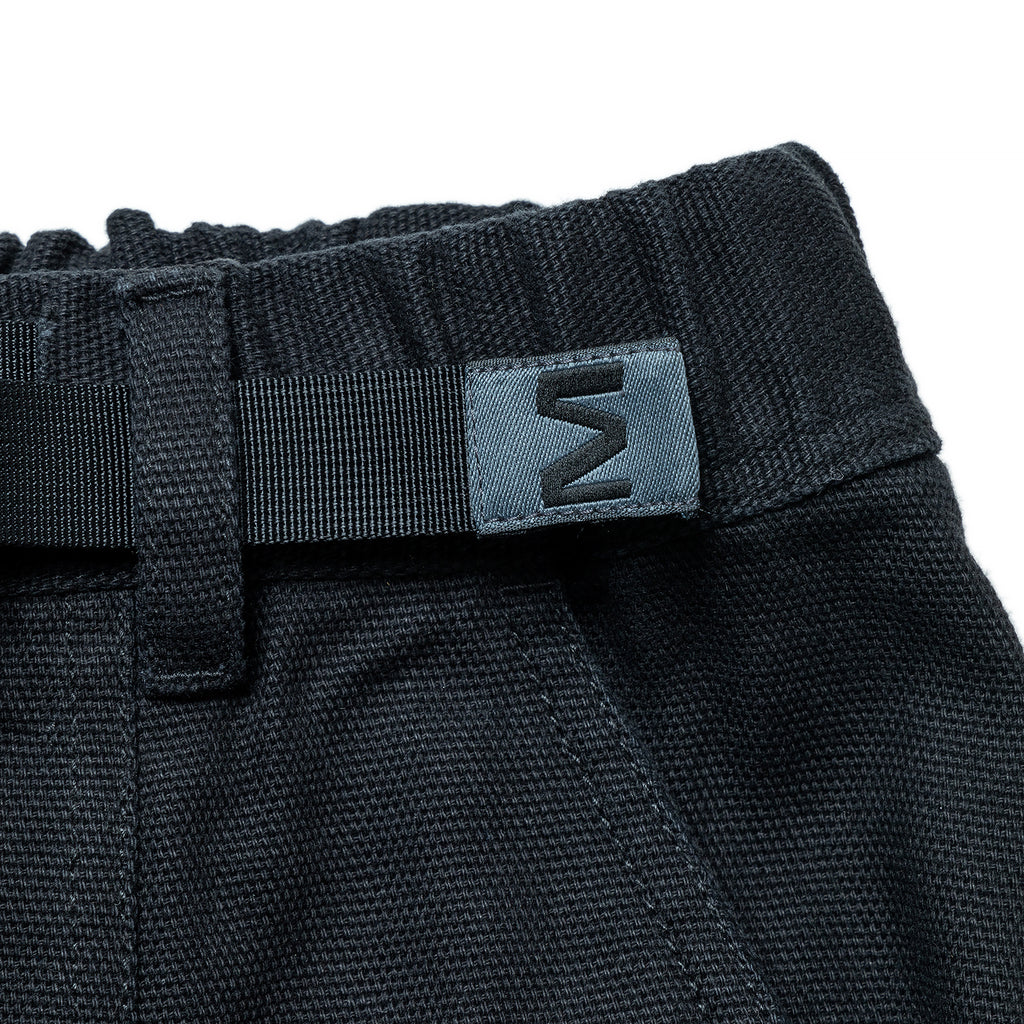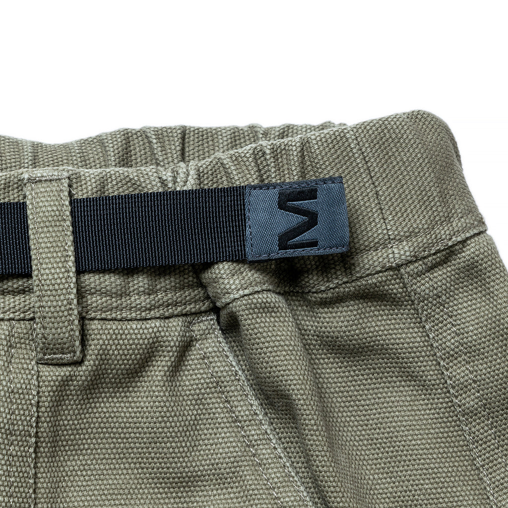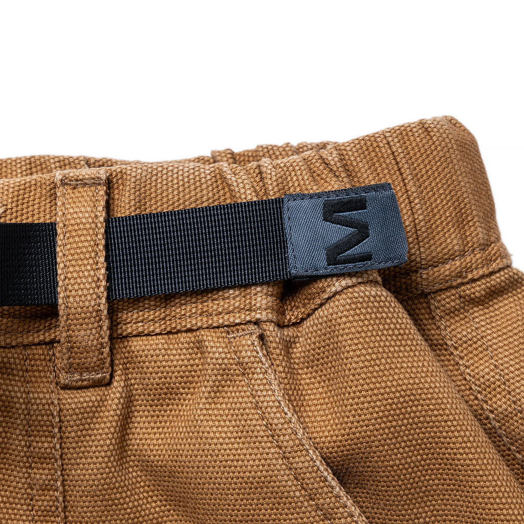 ウエストはウェビングベルトで調整可能で、ベルト先にはMロゴのオリジナル織りネームを作成して付けました。