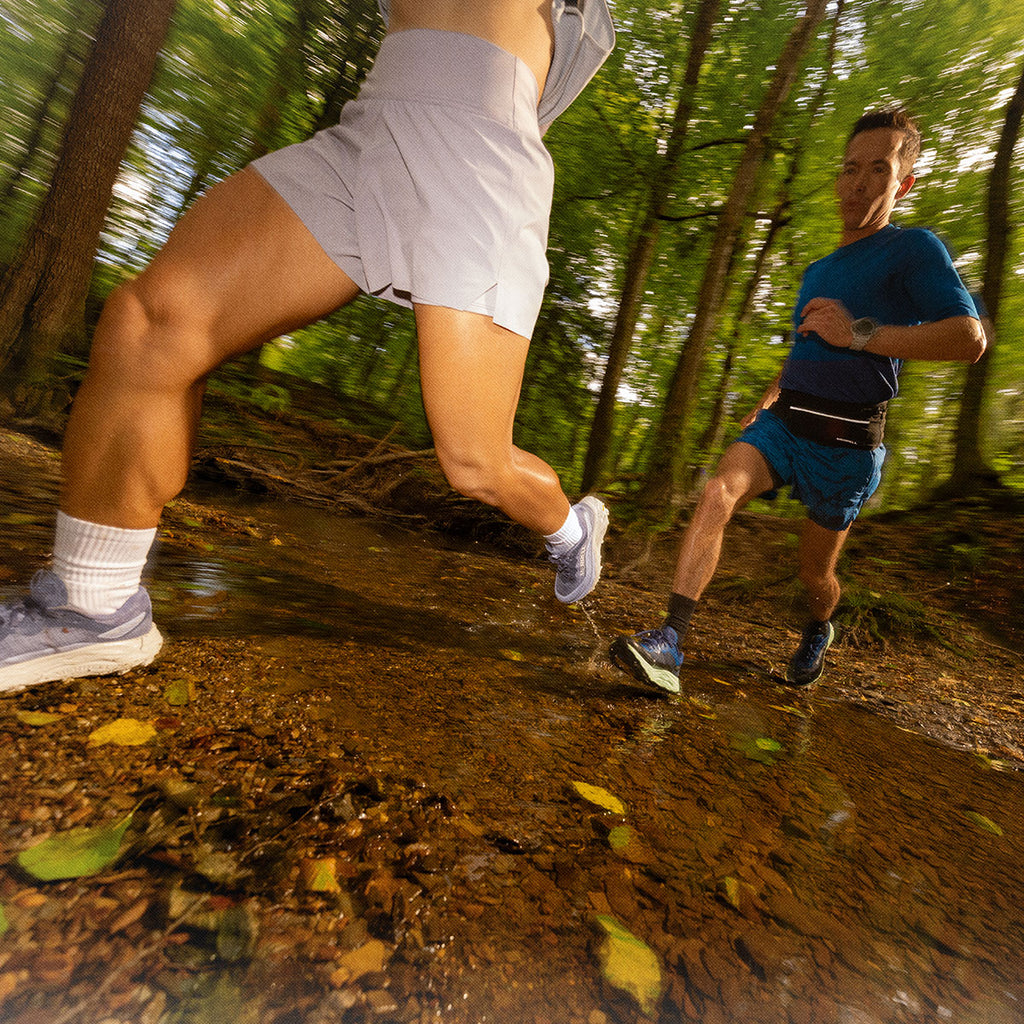 アッパーには、ナイロン繊維を格子状に縫い込んだ高強度ファブリックであるリップストップナイロンを採用。そこに防水メンブレンとして“GORE-TEX® Invisible Fit(ゴアテックス® インビジブルフィット)”を搭載しました。防水性・防風性・透湿性に優れたゴアテックス®ファブリックをアッパーに直接接着する特殊構造で、1枚生地になることにより、空気の隙間が無くなり、水の吸い上げが減ることで速乾性が向上するとともに、重量も18%削減。しわ、折り目、縫い目による擦れも排除され、ゴアテックス®非搭載のモデルと同じような自然なフィット性を感じることができます。