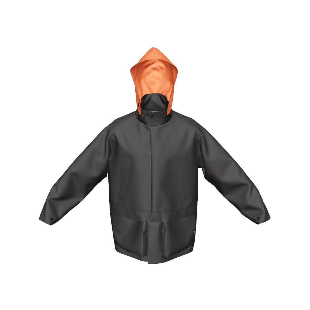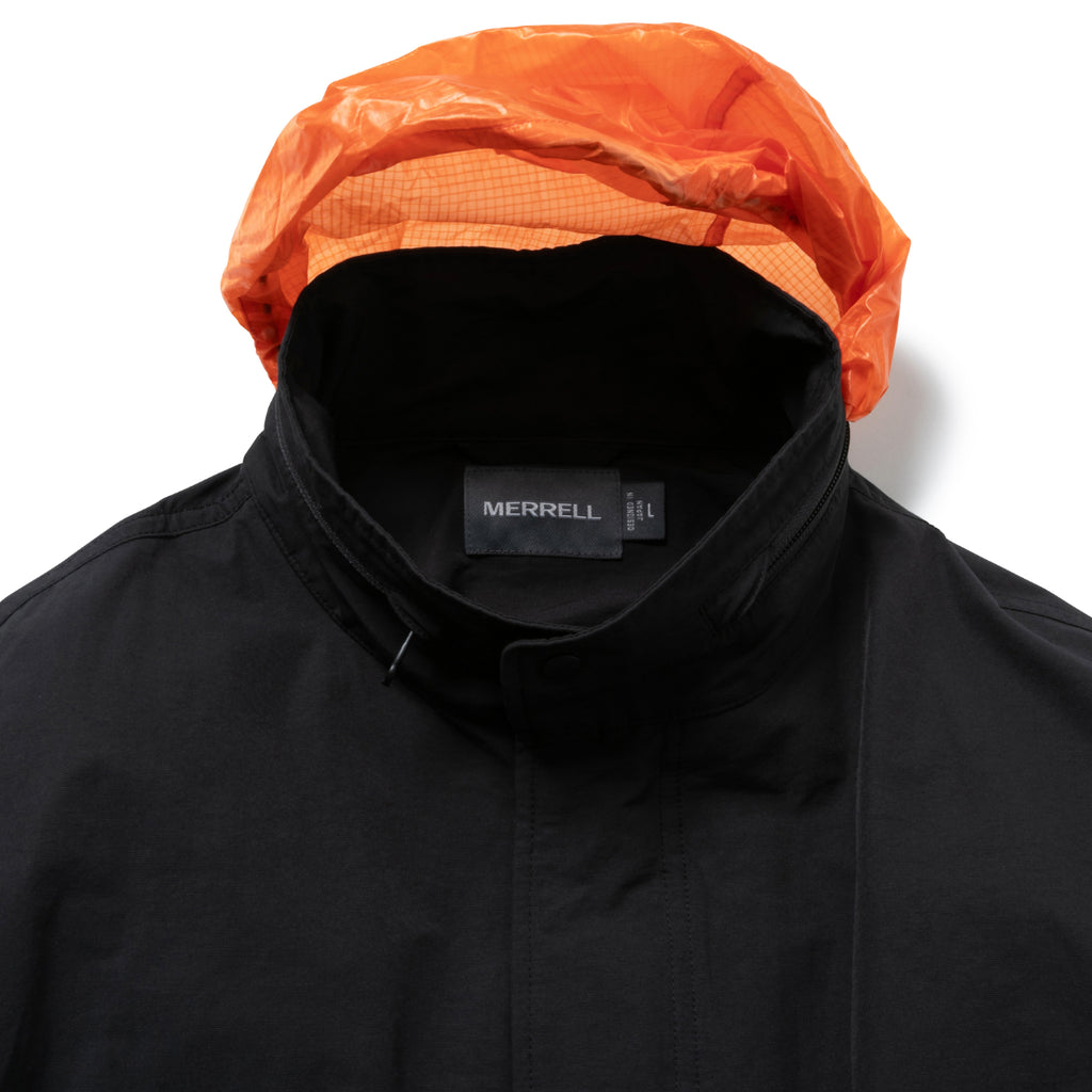 突然の雨を簡易的に防ぐバイカラーフードは、堅牢なデザインのアクセントとしても機能します。
